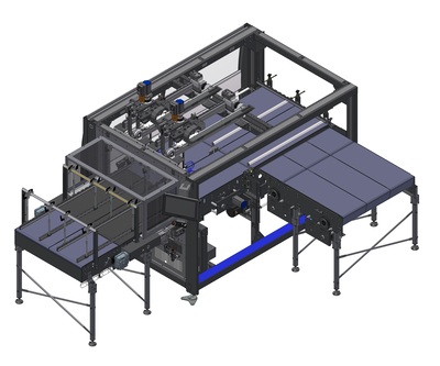 La cesta de producto toma la capa de paquetes de una cinta transportadora a altura operador. Los movimientos verticales de la viga y los verticales de la cesta de producto aseguran trayectorias perfectas para la formación del palét.