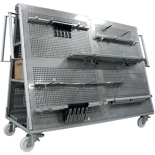 El carro tiene paredes de rejillas donde se pueden colocar fácilmente diferentes tipos de utensilios para tenerlos siempre en orden y al alcance de a mano; el interior también presenta el espacio dividido de forma sencilla y racional, para poder agrupar los diferentes tipos de herramientas en compartimentos específicos. Este carro portaherramientas está equipado con ruedas para poder trasladarlo fácil y rápidamente por la línea de producción hasta la zona más conveniente para el operador.