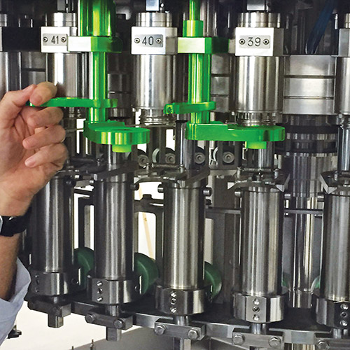 Dicho accesorio levanta las falsas botellas, las “atornilla” en las válvulas de llenado y las “descarga” a final del ciclo de limpieza; este sistema permite que el operador no entre nunca en contacto con la máquina, lo cual previene por tanto potenciales riesgos de contaminación del producto.