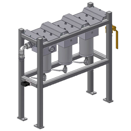 El grupo de filtración está constituido por una “mesa” de metal en la que están fijados los envases de tres cartuchos/filtros, que permiten conseguir tres fases de filtración: