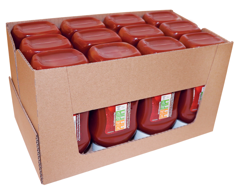 Tag: Caja wrap-around - Empaque shelf-ready - Botellas PET - botellas en PP - Productos alimentarios - Salsas - 3x4 packs